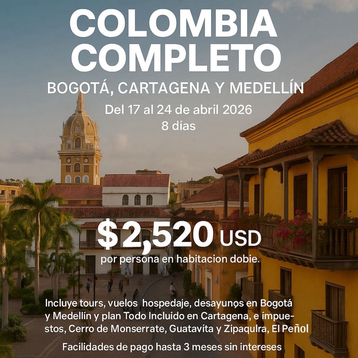 ✅ Incluye tours, vuelos, hospedaje, desayunos en Bogota y Medellin y plan Todo Incluido en Cartagena, así como impuestos.